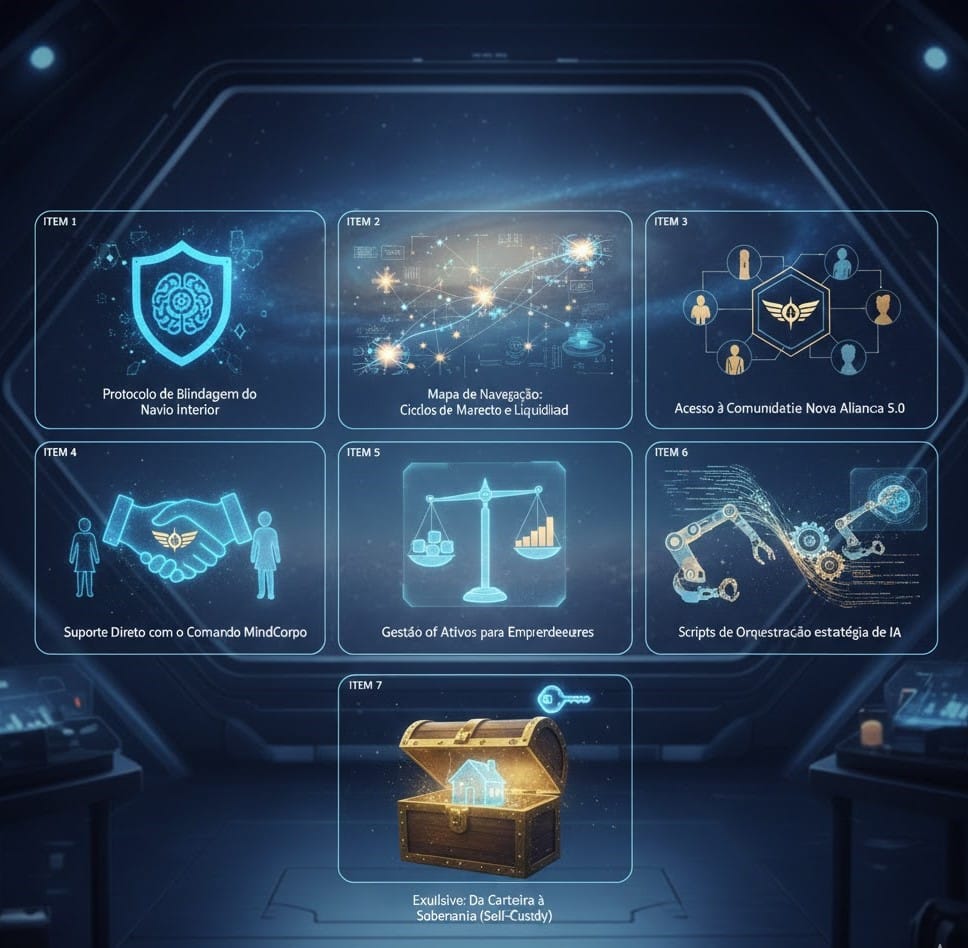 A Nova Aliança 5.0 é o seu portal para a elite digital. Nós não entregamos apenas ferramentas; nós entregamos a arquitetura do Orquestrador da IA. Você aprenderá a integrar sua visão pessoal a agentes inteligentes que executam, filtram e multiplicam sua produtividade. É a estrutura da MindCorpo aplicada ao seu negócio: segurança, escala e poder de comando.